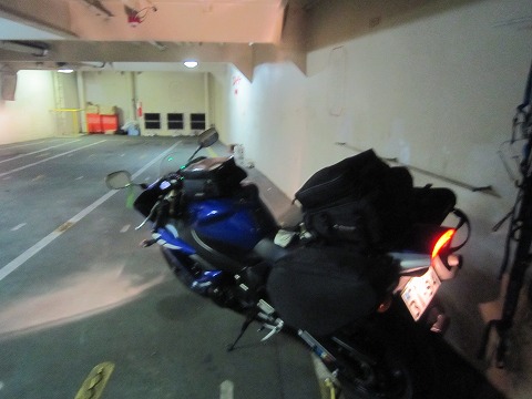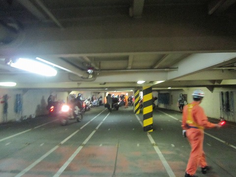 16:49 乗船 フェリーのランプウェイを渡り船内へ。 乗り込んだのは4階の甲板。 スロープを2つ下りて2階の駐車スペースにバイクを駐めます。 2階は天井が低くて、圧迫感がありますね。 船が揺れてクルマが動いたりして人間が挟まれると事故になるので、フェリーの航行中は駐車エリアへの立入は出来ません。 バイクを駐めたら、荷物を外して、ヘルメットと一緒に持っていきます。 もし航行中にバイクが倒れたら、キズが付いてしまうこともありますので、ヘルメットも持っていった方がいいでしょう。 |