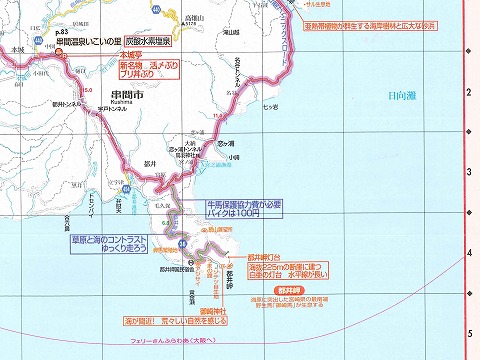 昨晩フェリーの中でルートを確認していると、今日予定している佐多岬に行くだけだと時間が余りそうでした。 だったので、ツーリング・マップルを眺めていて、都井岬が目に飛び込んできました。 ”ツーリング・ライダーは端っこが好き。” (^o^)v 志布志から都井岬は片道およそ40km。 志布志から佐多岬に行くのと逆方向なので往復で80km、行って帰ってざっと2時間。 ツーリング・マップルにもお薦めのルートになっています。 時間的に大丈夫そうなので、まずは宮崎県の最南端”都井岬”に行ってみることにしました。 ※ 地図はツーリング・マップルから転載させていただいきました。 |