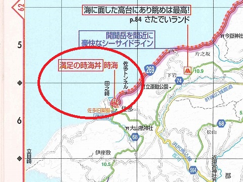 まあ、えっがね丼にブレーキがかからなかった、もう一つの理由がこれ。 ツーリング・マップルにあった情報で、佐多岬に行く途中の佐多伊座敷(いざしき)にある海鮮丼の時海。 今日の昼食はこれでしょ! と半ば決めていたわけです。 ※ 地図はツーリング・マップルから転載させていただいきました。 |