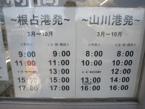 16:26 明日は 明日は5月1日(日)なので、始発の9時から2時間おきの出航。 朝9時に乗るためには・・・・・。 ちょっと早すぎるので、ちょっと無理かな。 11時発のフェリーに乗れるよう、来ることにしましょう。 |