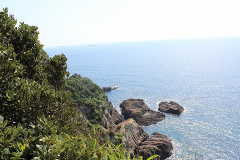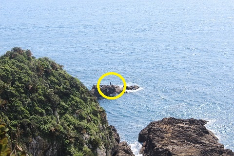14:50 右手に海 遊歩道を10分ほど歩くと、右手に海が見えてきました。 岩場をよく見ると動くものが・・・・。 |