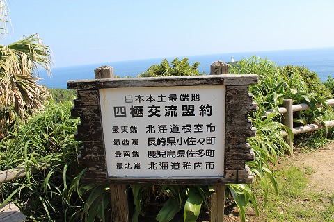15:08 本土四端 本土四端の交流盟約の看板。 最北端の北海道稚内は2010年の北海道ツーリングの時に訪れました。 最東端の北海道根室は2003年の8月にやっぱり北海道ツーリングに行ったときに訪れています。 しかし、その時はまだデジカメが今みたいに進んでなくて、たくさん写真が撮れなかったんですね。 そのため、根室を訪れたときの写真を撮ってないです。 (゜o゜; (残念!) 最西端は長崎県小佐々町、現在は佐世保市。 ここは今回のツーリング中に訪れる予定です。 そして、最南端はここ鹿児島県の佐多岬です。 |
