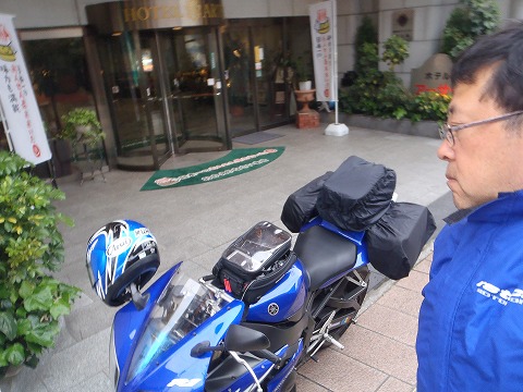8:15 カッパを着込んで ツーリングバックにレインカバーをしました。 これで、雨が入らないように二重に袋に入れているので、大雨でも大丈夫でしょう。 そして、自分はカッパを着込んで、準備ができました。 それでは、仕切り直して「出発! |