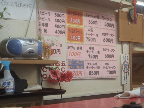 14:00 注文は さっそく、入店。 予想通りカウンターのあるラーメン屋さんでした。(席はカウンターのみ) カウンターの一番端の席に座って、イスが濡れないよう、カッパをヒザ下まで下ろして座ります。 メニューは潔く、ラーメン(醤油)と味噌ラーメンのみ、トッピングもチャーシュー麺があるのみで、大盛にしようか迷います。 が、カウンターの脇におでん鍋を発見、”おでんつまんで普通盛り”に決定しました。 ラーメンはチャーシュー麺にしたけどね。 (^o^) ラーメンができるまでおでんでもつまみましょう。と言うことで、おでんを注文。 |