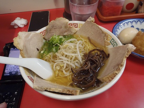 14:02 チャーシュー麺 おでんを食べようと思ったら、先にチャーシュー麺(¥650)が出てきちゃいました。 早っ! チャーシューは分厚いのが5枚! で、このお値段ですから得した気分。 それでは、『いただきます!』 スープは九州の白濁した豚骨系が出てくるかと思いきや、意表を突かれて澄んだ醤油味。 スープを飲むと、「旨っ!」 オーソドックスな、鶏と野菜から取ったスープですが、手抜きなしにちゃんと取ってあって鶏の旨さと野菜の甘みが良く出ています。 周りに何も無いへんぴな場所(失礼)で、こんな時間にもかかわらずお客さんが入っているのもうなずけます。 歳を取るとこう言う優しい味のスープが良くなるんですよね。 麺は、細麺です。 なので、注文するとすぐにでてくるんですね。 この細麺もスープに合ってます。 (^_^)v |