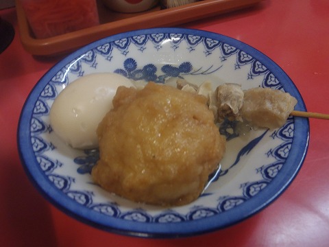 14:02 おでん おでんの種は何種類かありましたが、頼んだのはタマゴ、スジ、それに聞いた事がない”げんこつ”をお願い。 タマゴは100円で、他はそれぞれ120円。 そう言えば、足柄のうどん屋さんにおでんが置いてあったり、富士宮焼きそばのお店に置いてあったりしたことはありましたが、私の記憶が正しければラーメン屋さんにおでんが置いてあるのは初めてかもしれない。(笑) おでんはラーメンと同じ様に、汁が澄んでいてどれもあっさり味。 関東のようには煮込まないみたいですね。 ラーメン+おでん、雨で冷えた体が暖まります。(^_^)v |