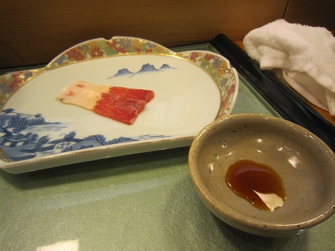 18:13 一品目は まず最初に供された一品はミンククジラ。 定置網に掛かったものだそうです。 今ではイカで有名な呼子ですが、太閤秀吉の時代から昭和初期までは国内有数の捕鯨基地だった歴史があるそうです。 なので、今でもクジラを食べる文化が残っている様です。 ミンククジラはクセもなく、イヤな匂いもなく、ちょっとつまむにはイイですね。 脂部分に甘みがあって、融点が低いようで、口の中に入れると、脂が溶け出してきます。 器はきれいなものを使われていますが、器に関しては、は自分は不勉強です。 (-_-;) クジラ肉は、供されれば食べますが、自分的には積極的に注文ことはない食材かな。 |