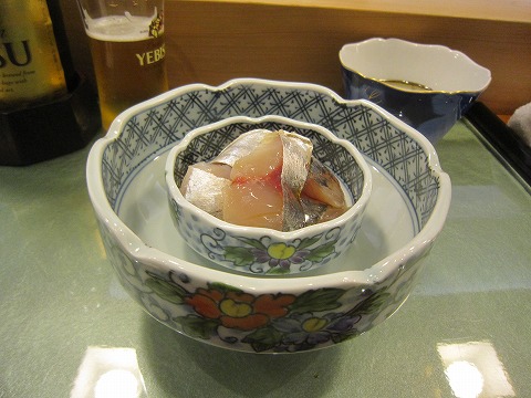 18:28 釣りアジ 続いて、アジ。 アジは釣りアジで沖で活き〆にしたものだそうです。 このアジが一口食べて、びっくりポン! 自分の個人的な感じなんですが、アジは独特のクセと言うか、臭みを感じていて、「生で食べたいなぁ。」とはあまり思わない魚でした。 同じ光りものを食べるのであれば、サバとかコハダが好みでした。 時期によっては、サヨリなんかも美味しいですよね。 でも、このアジは違いましたね。 その独特のクセに感じられるものはまったくナシ。 サバやカンパチなどに似た青魚の旨味があって、 『アジってこんなに美味しいんだ~。』と再認識、今回一番の収穫でした。 また、使っている器がきれいですね。 |