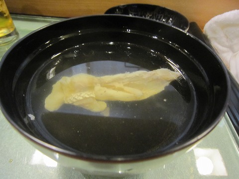 18:36 潮汁 潮汁、タイのお吸い物です。 食事の前半でお椀を供するのは、懐石っぽいですね。 入っている具は”タイの皮”です。 汁はタイから出汁を取ったもので、上品です。 美味しいです。 (西日本は鯛を上手く調理しますね。) このお店では、生ビールを準備していませんが、意図として置いてないと推測します。 おそらく生ビールだと、水分量が多すぎて、肴とのバランスが崩れるんではないかと思います。 濃いめのビールが合います。 汁ものの写真は、汁に光が写り込んで難しいですね。 |