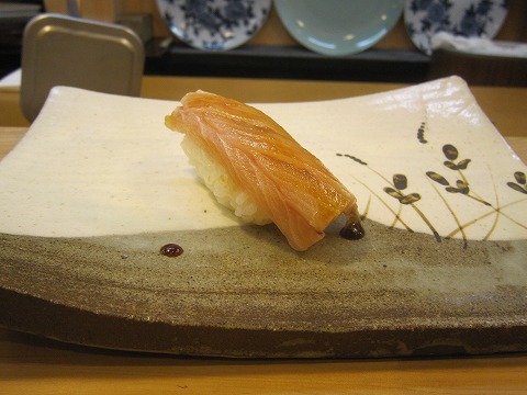 19:02 寒ブリ 寒ブリです。 「この時期に?」 と思われるでしょうけど、真冬に10kgほどの大物を丸ごと1匹買ったそうで、-50℃の超低温冷蔵庫を持っているので、そこで保管してあるとのことです。 この時期に寒ブリの旨味が味わえます。 握りはすべて、刷毛で醤油を塗ってから提供されます。 塗られるのは握りの種類によって、ツメだったり醤油だったりします。 |