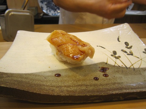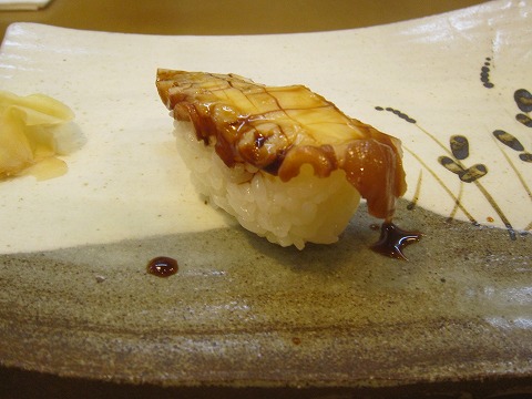 19:13 地ダコを握りで 先ほどつまみで供された地タコを今度は握りで。 タコには、アナゴの骨で出汁を取ったツメが塗られています。 さっぱりとしたタコの味と甘めのツメが合います。 |