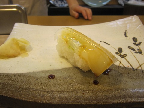 19:19 アオリイカ お待たせです。 イカです。 呼子のイカじゃありません。 (^_^;) ”アオリイカ”だそうです。 これも刷毛で醤油が塗られています。 刷毛で塗った方が全体に塗られるため、塩っぱくなりすぎず美味しい様な気がしました。 (寿司屋さんにMY刷毛を持っていたら、怒られるだろうか?) ”呼子のイカ”と呼ばれているのは、呼子で”ヤリイカ”と呼ばれている様ですが、”剣先イカ”のことの様です。 この”アオリイカ”とは同じ”ヤリイカ科”ですが、この”アオリイカ”の方がより美味でイカの中で一番美味と言われています。 こうして切り身にされたら何のイカかわかりませんが、美味しいことに間違いありません。 今回、呼子のイカはたべられませんでしたが、それ以上に満足。 (*^_^*) |