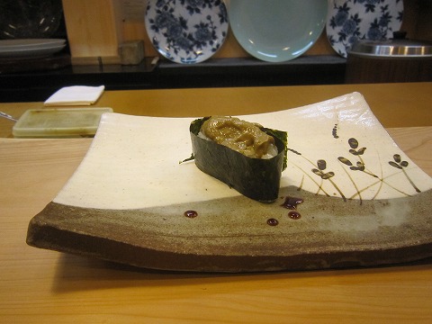 19:30 カニみそ軍艦 カニみその軍艦です。 海苔が美味いです。 後ろに写り混んでいますが、棚には立派なお皿が並んでいます。 陶芸が好きなお客さんは、このお皿を見るために通われている方もいるとか。 もう少し陶芸のことがわかれば、人生が豊になるかもしれませんね。 でも、「勉強してまで」とは体がうごかないんですよね。 |