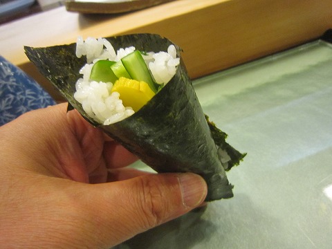 19:34 手巻き 手巻きです。 ここで手巻きを出すご主人のこだわりは、”海苔”です。 有明海で採れる良質な海苔が手に入ったので、海苔を味わって欲しいと言うことだそうです。 確かに、海苔は密度があって香り高いです。 まあ、普段あまり海苔に気を配って食べることはありませんし、どれくらい凄いか自分には判断できません。(^_^;) |