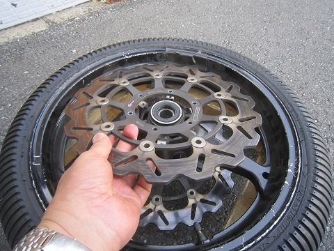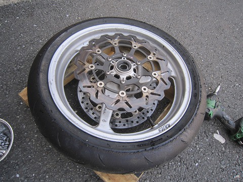 16:04 交換中 取り外したBRAKINGのディスクを新しいCBRのホイールに取付け。 今度のCBRのホイールは銀色です。 |