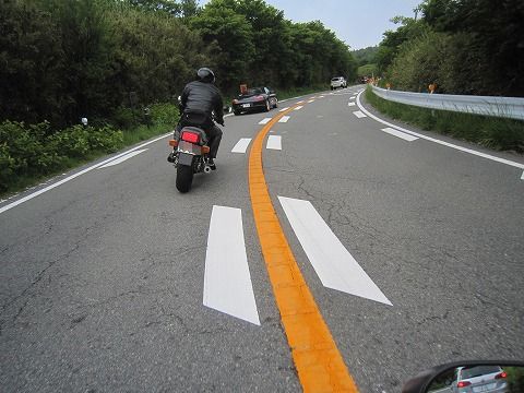 10:32 後半の伊豆スカは 亀石のパーキングで休憩した後、ふたたび伊豆スカイラインを南下します。 冷川(ひえかわ)の料金所を過ぎて、交通量も少なくなり、快適にバイクを走らせます。 亀石のパーキングより手前(北側)の伊豆スカは山の尾根部走っているため、景色は良いのですが、目標物が少なく、速度・距離感覚が掴みにくくて自分は走り難いです。 亀石より南側は、写真の様に極々普通のワインディングになり目標物も増えるので、走りやすいですね。 前を走るタグロンさん、高速コーナーにもかかわらず、バイクはかなりバンクしています。 軽く300キロは出てますね?(笑) |