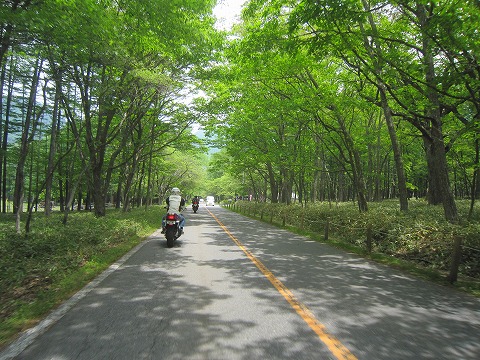11:29 奥鬼怒林道へ みんなそろったところで、休憩しようということになり、ちょこっと移動します。 さっきほどの戦場ヶ原の光徳入口の交差点を曲がり、国道120号線を離れ、奥鬼怒林道に入り木立の中を進みます。 梅雨入り直後、新緑の木の葉がきれいです。 この辺りは標高が高く涼しくて気持ちいいですね。 今日はメッシュジャンパーを着てきましたが、走っていても快適です。 |