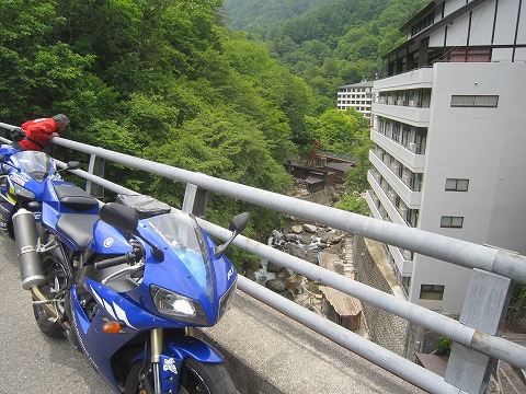 12:25 奥鬼怒林道 光徳牧場を出た後、奥鬼怒林道を東進して、川俣温泉の噴泉橋までやってきました。 噴泉橋から鬼怒川をのぞきこむと、鬼怒川沿いのある露天風呂がのぞけます。 が、だれも入っていませんでした。(笑) 光徳牧場を出てからここまでの奥鬼怒林道は20km弱ほどの距離があります。 林道は全面舗装されていますが、センターラインはなく1.5車線の対面交通です。 林道はアップダウンがあり全線がほぼ低速コーナーで構成されていて、ジムカーナコースの様にタイトでタフな路線です。 流石に抜け道として使われることも少ないので、交通量はほとんどありませんが、ハンドルが低いスポーツバイクで走るには、手首に負担がかかります。 とってもタイトなので、クルマでは走る気がしませんね。 今日は路面がきれいでしたが、雨の後、秋の落葉の季節などは、路面コンディションが良くないのは、容易に想像できます。 |
