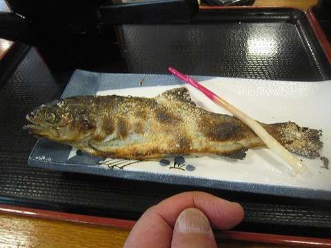 12:11 ヤマメ 蕎麦を食べていると、ヤマメが焼き上がりました。 先々週食べたイワナより、少々小ぶり。 (-_-;) ヤマメもイワナ同様サケ科の魚で、海には下らない淡水型。 海に下るのは、サクラマス。 で、天然のヤマメは、太平洋側では、神奈川県が南限だそうで、それ以南はアマゴの生息域だそう。 そう言えば、四国ツーリングで売っていたのはアマゴだったけ。 ヤマメはちょっと独特なクセがあるかな。 でも、自分は気になるほどではありません。 ヤマメの味の個性かな。ぐらいな感じです。 身が小さくて、食べ応えがなくて、少々残念でした。 |