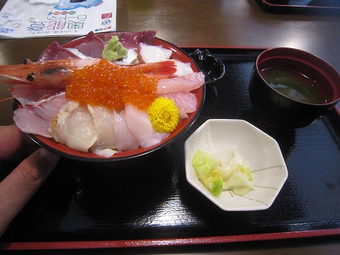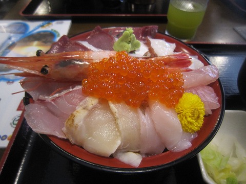 12:33 海幸丼のネタは ネタはエビにイクラにホタテ、カツオ、キンメにのどぐろにタコ、あとワサビに菊・・・・・。 ワサビと菊はネタじゃありませんから・・・・・。 (-_-;) いずれにせよ、豪華に盛ってあります。 それでは、早速 『いただきます!』 言わずもがな、書かずもがな、美味い。 (*^O^*) やぱし日本海側で食べるのどぐろは旨いですね。 |