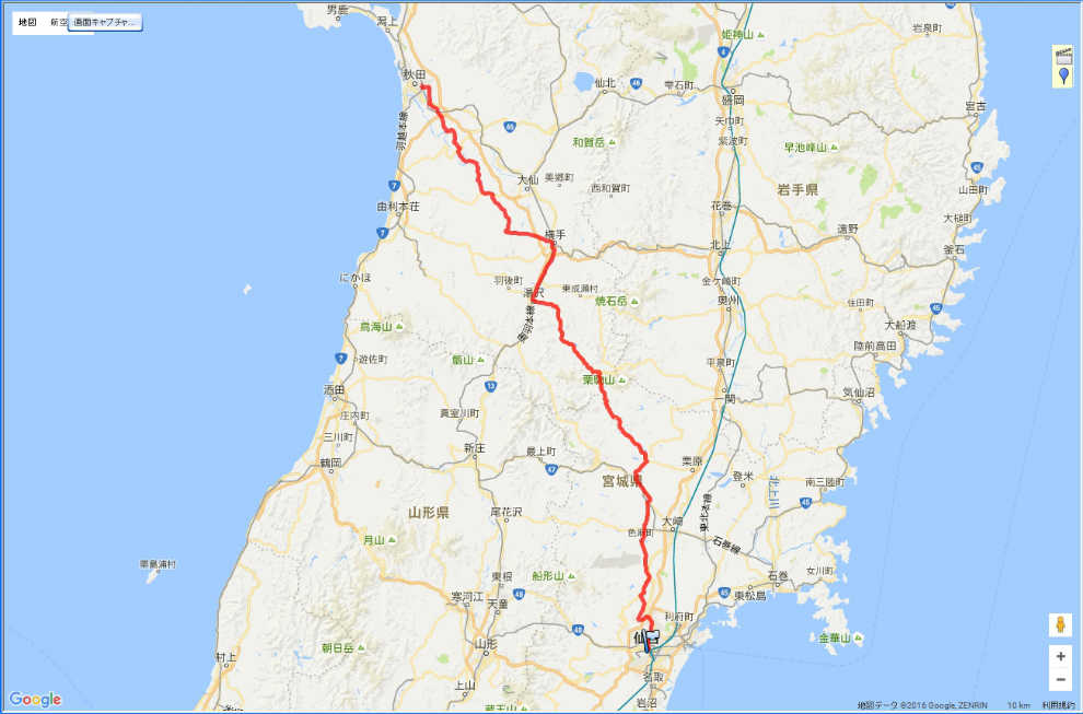| 仙台市内〜国道457号線〜国道398号線〜国道13号線〜秋田県道等々〜秋田市内:238.6km | |