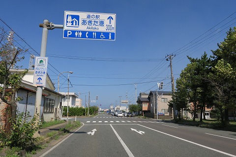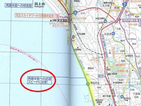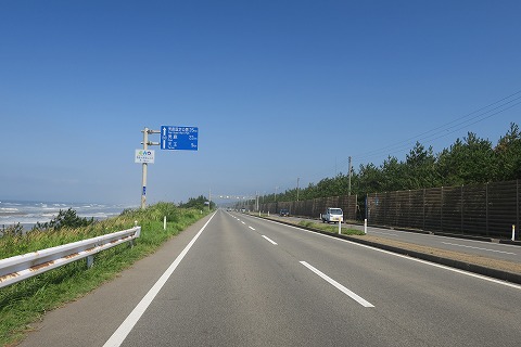 9:26 男鹿(おが)半島に 当然ですが、真っ直ぐ深浦の宿には向かいません。 まずは、男鹿半島の先っちょ、入道崎を目指します。 秋田市内にある昨晩の宿ドーミーイン秋田を出発して、まずは西走。 臨海十字路で国道7号線に突き当たったら、右折してまずは国道7号線に入り北上します。 国道7号線を北上すること7kmあまり、道路看板にしたがい男鹿半島方面に進みます。 国道7号線はちょこっとしか走っていませんが、流石に一桁国道、交通量も多いですね。 |