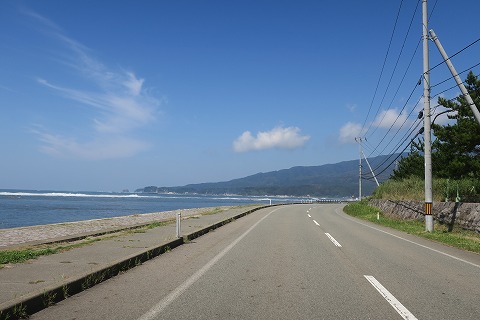 10:14 県道59号男鹿半島線 国道101号線で男鹿市まで進んだ後、今度は県道59号線に入り男鹿半島を時計回りに周遊します。 国道101号線を離れると、県道はセンターラインのある片側1車線の対面通行になり、交通量もグッと減って走りやすくなります。 海岸線に沿って走る県道59号線はこの辺りではアップダウンはほとんど無く、直線を緩いカーブで結び、景色を眺めながら走れる快走路です。 |