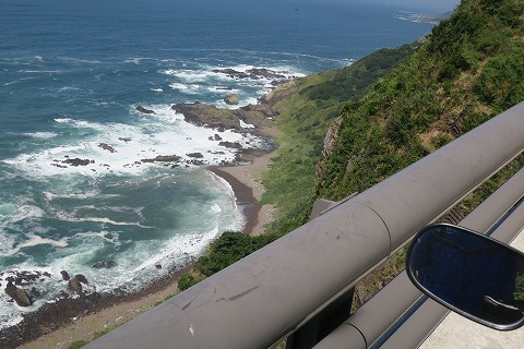 10:23 断崖の上 男鹿半島の西岸に入ると、県道59号線は急激に標高を上げていきます。 県道は断崖絶壁の上を走ります。 景色はイイのですが、ちょっと怖い。(笑) GPSレコーダーのログを見てみると、高いところで200mぐらいのところまで上がって行ってますね。 |
