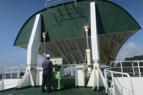 9:19 ゲートを閉じる クルマの乗船も終わり、出港直前になりました。 船首にある、ゲートを閉じます。 ※ 面白そうなので、GIF画像を作成して貼り付けてみました。 (上手くいくかな?) |