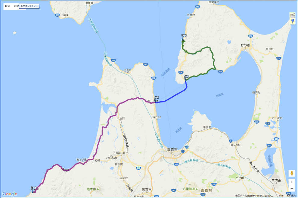 | 深浦〜蟹田(フェリー乗り場):102.2km、蟹田〜脇野沢(フェリー):21.6km、脇野沢(フェリー乗り場)〜佐井村福浦:61.5km | |