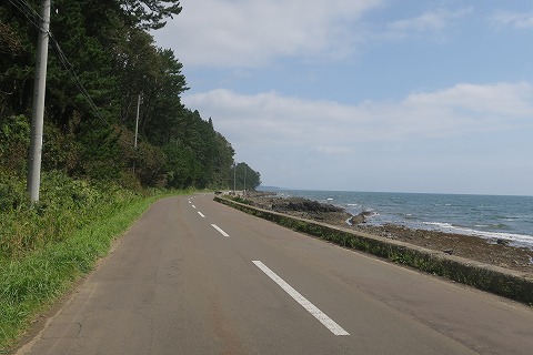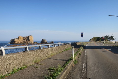 7:12 波が静か 深浦の市街地を出発して、日本海に沿って昨日に引き続き国道101号線を北上します。 昨日までは波が高かったですが、今朝は静か、凪いでいるようです。 |
