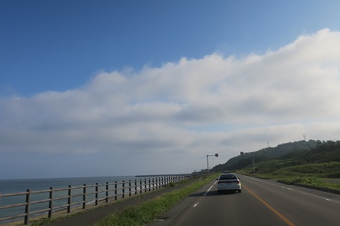 7:19 日本海を一望 国道101号線は、この区間バイパス化されているようで山側に入ります。 ちょっと小高い場所から、一気に海側に下っていく国道。 日本海が一望出来て、景色が良いです。 |