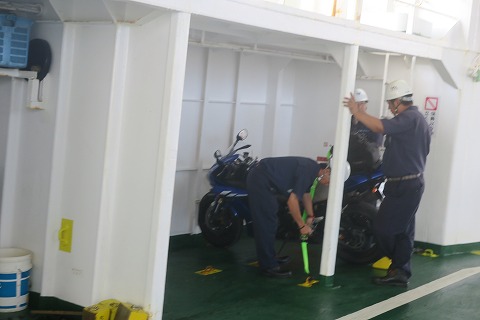8:54 乗船 一番乗りで、乗船。 車両甲板の端っこの壁際に停めて、バイクを固定します。 今日は乗船するクルマが少ない様で、甲板員もヒマそう。 3人係でバイクを固定していました。 |