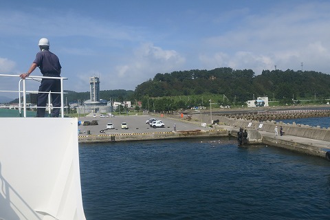 10:25 まもなく着岸 脇野沢港が近づいてきました。 まもなく着岸です。 定刻の 10:20着より少し遅れていますね。 埠頭には、バスが2台すでに待っています。。 載せられるバスが最大4台だから、これで乗車率50%は確保だな。(笑) しかし、この時間に観光バス2台がここに居ると言うことは、どこから来たんでしょうね? |