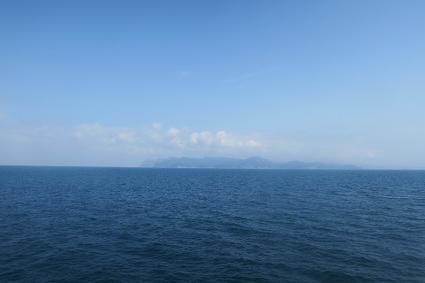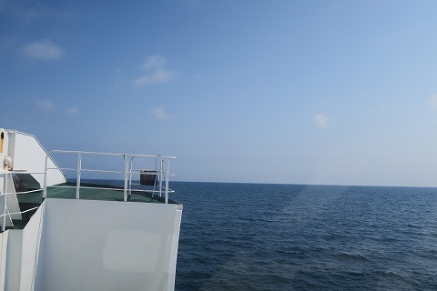 9:51 下北半島が さらに進むと、前方にうっすらと下北半島が見えてきました。 フェリーは陸奥湾の中を走っていることもあってか、波もなく、順調な航海を続けています。 |