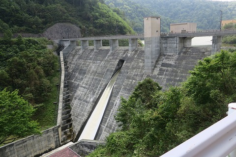 11:08 川内(かわうち)ダム 県道253号線を西走し、途中にある川内ダムまでやってきました。 県道から見えるダムは、火曜日に通過した台風10号の影響がまだ残っている様で、勢いよく放水される水がまだ茶色く濁っています。 この川内ダムは本州最北端に位置するダムだそうです。 川内ダムによってせき止められ人造湖はかわうち湖です。 |