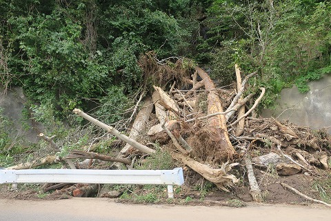 11:08 台風の爪跡 ダム湖脇、県道沿いの沢には、上部から流されてきたと思われる木と土砂が堆積していました。 おそらく台風10号による被害だと思われます。 道路の脇には溢れ出した土が、道路に堆積していました。 |