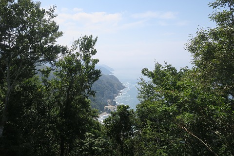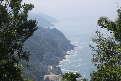 11:26 仏ヶ浦(ほとけがうら) 県道253号線から国道338号線に入り、陸奥湾に沿って下北半島の西岸を北上します。 脇野沢から大間までの国道338号線は、通称海峡ラインと呼ばれ、綺麗な陸奥湾の景色を眺めることができます。 国道338号線を少し北上すると、仏ヶ浦が見える駐車場があってので、ちょっと停まります。 駐車場に設けられた展望台に上がると、狭い木々の隙間から仏ヶ浦の断崖絶壁を見ることができます。 デジカメに収めてみましたが、イマイチ小さくてわからないので、ズームアップ! |