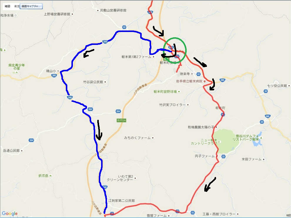 | 正解は青い線。 軽米ICのところで、グルッと右にUターンする形で走れば正解。 で、左折して間違えて、道が狭くなったので、Uターン。 戻って、また間違えて、あとはナビ頼みで、国道340号線に復帰です。(笑) まあ、また走る事は無いと思うけど、一応備忘録として。 (^_^;) |
