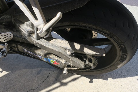 13:39 オフ車か? 給油の際にサイドスタンド側に目をやると 『汚っ!』 チェーンカバーも泥だらけ。 まるでオフ車の様です。(笑) |