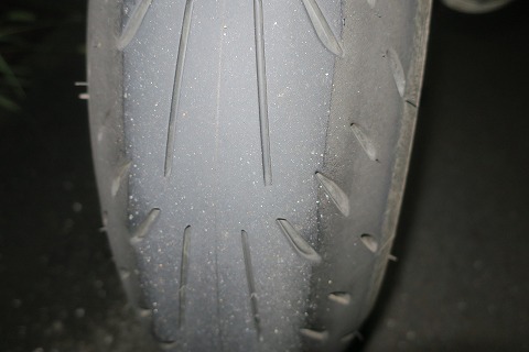 24:14 走行後のタイヤ 上 前輪、下 後輪。 前輪は MICHELIN の Power cup EVO。 39,011 km で交換したので、ここまで 47,096 − 39,011 = 8,085 km 走りました。 流石に、ウェアインジケータを見え始めました。 後輪は同じくMICHELIN ですが、こちらは Power SuperSport EVO。 こちらは、後から交換したので、ここまで 47,096 − 44,938 = 2,158 km 走りました。 こっちは、まだまだ。 センターとサイドでコンパウンドが違うのですが、それがはっきりと見えますね。 |