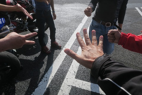 8:23 暇つぶしに 自分が最後かと思ったら、まだ来てないメンバーが一人いました。 連絡があり、ちょっと遅れそう。 待っている間、時間があれば、ジュースジャンケン。(笑) 手に年齢は隠せません。(笑) |