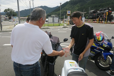 10:38 常陸大子駅(ひたち だいご えき)でジュージャン 国道461号線に入り、ちょこっと西走、大子駅前にやってきました。 ここでちょっと休憩。 否、ジュージャンするよ。 日中にあると、暑かった。 休憩中はライディングウェアーを脱いじゃいます。 で、自分はさっさと一抜け。 今日はジャンケン強いのだ。(笑) で、CBR1000さんはアイスエイジさんと、負け残ってしまったようだ。 コシドラちゃんもまた負け残ってるね。 |