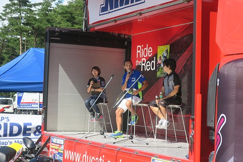 11:39 トークショー 11時40分からは、ステージエリアでトークショー。 ゲストは元WGP250ccチャンピオンの原田哲也さんと、SUZUKIのMotoGP開発ライダーの青木宣篤さん。 8耐とかだと、結構トークショーとかやってますが、今回は無料のイベントなのでナップスさん頑張ってますね。 ツーリング・ライダーも気軽に見ることができて、ありがたいですね。 |