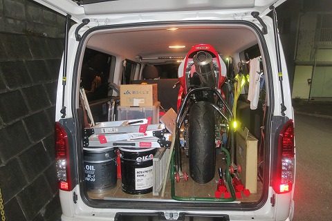 17:59 積み込み 明日は、恒例のエビスサーキット走行会です。 仕事を早めに切り上げて帰ってくることが出来たので、出発前にハイエースのオイル交換をして、バイクの積み込みをしました。 エビスの走行会には今年の5月に参加したのですが、当日は雨だったため、心が折れて結局走らず。 そのため、エビスの走行会は去年転倒してケガをして以来の1年半ぶりになります。 |