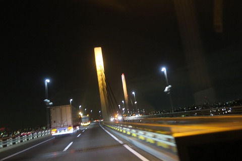 21:26 かつしかハープ橋を通過 首都高湾岸線を北上。 スマホのgoogle ナビでルートを確認すると、首都高の都心環状線を使って都心部を突っ切るよりも、中央環状線を走った方が早いとルート案内。( ホントか?) ルート案内を信じて、湾岸線を葛西JCTまで進み、中央環状線に入り北上してかつしかハープ橋までやってきました。 かつしかハープ橋は、S字カーブに架かる珍しい曲線斜張橋で、夜間はライトアップされていますが、走りながらの写真では、きれいに撮れませんでした。 ※ 暗さに強い裏面照射型のデジカメを買ったのですが、暗いところで動きながらの撮影はやっぱり難しいみたいで、今までのとそれほど変わらないみたいですね。 |