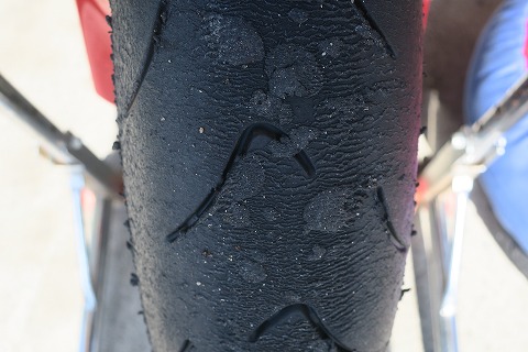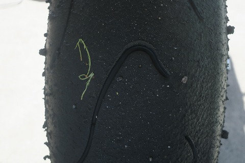 11:47 走行後のタイヤ 走行後のタイヤ。 フロント側 直進部分に縦方向にシワが寄ってますね。 特に問題は無いです。 やっぱり、タイヤカスを拾いやすい。(笑) |