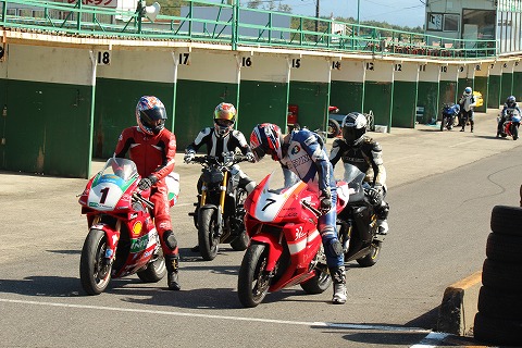 11:27 ピットロードに まずはコースインするため、ピットロード・エンドに並びます。 模擬レースはあくまでも模擬レース、お遊びですので予選もなし。 主催者さんが、午前中の各参加者のタイムを見て、グリッドを決めてます。 |