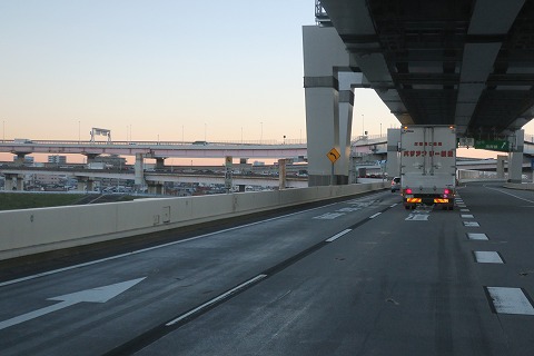 6:31 辰巳ジャンクション 大井本線料金所から首都高湾岸線を北東に走ります。 google map のルート案内にしたがい、葛西ジャンクションではなく、その手前の辰巳ジャンクションでルートを右に反れて9号深川線に入り、箱崎ジャンクションを目指します。 |