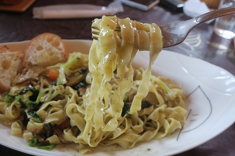 12:27 サザエのパスタ 注文したのは、伊豆らしく海の幸”さざえ”を使ったパスタ。 外の景色などを眺めていると、パスタが運ばれてきました。 パスタは乾麺のスパゲティと生麺 数種類の中から選ぶことができます。 自分が選んだのは、生麺のタマゴ麺をチョイスしました。。 それでは、「いただきます。」 |